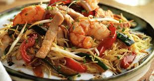 Fideos de arroz salteados con tofu y verduras.